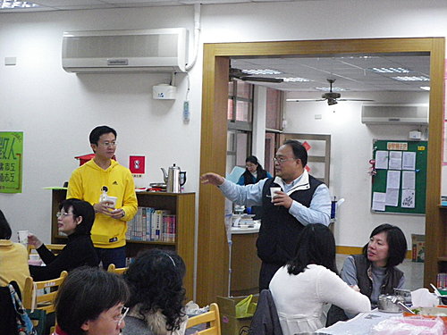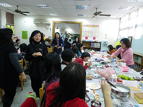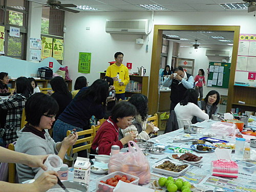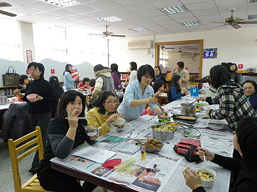 經過一番採購廝殺, 大家可餓壞了. 看看滿桌美食, 校長名言:”減肥是明天的事啦”! 恨不得有兩個胃啦! 真是太可口了!! 瞧大家滿足的表情, 年底尾牙之際, 志工隊犒賞自己, 真是十分圓滿喔! 大家共同企盼"年年有今日, 歲歲有今朝"喔!